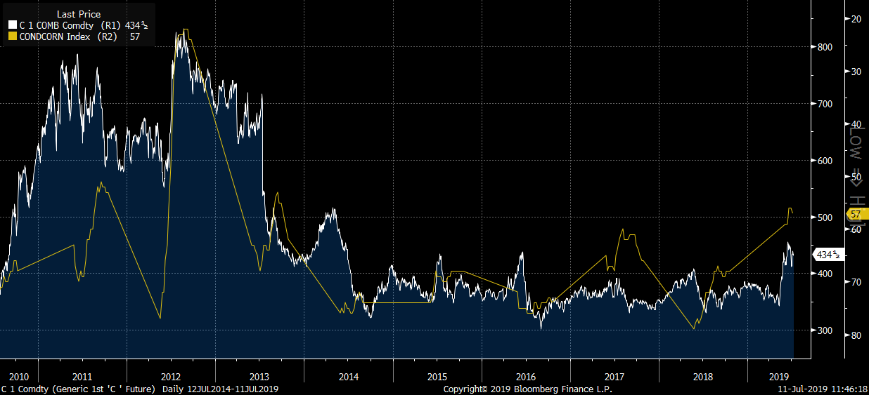 Corn crop quality in the US remains at relatively low levels. Source: Bloomberg