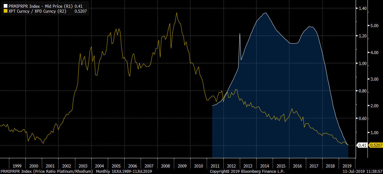 The platinum/palladium ratio and the platinum/rhodium ratio are at their extremely low levels. Source: Bloomberg