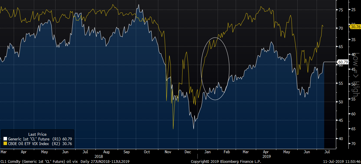 VIX index for oil prices dipped significantly. The situation resembles the one from January. Source: Bloomberg