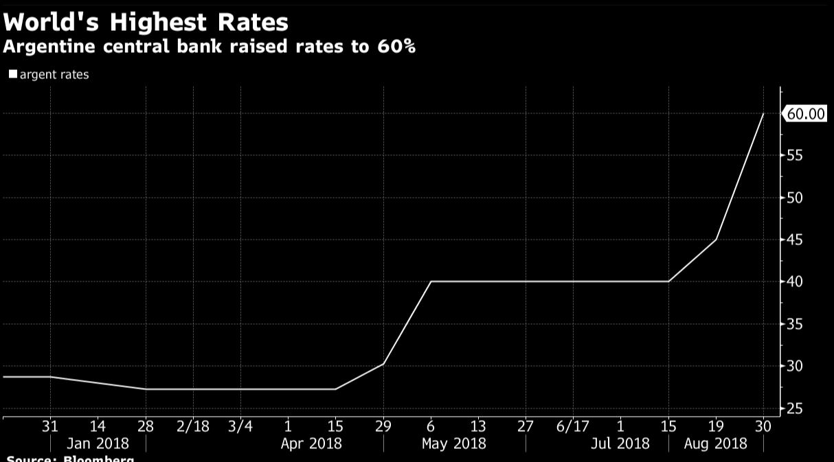 The Argentinian central bank has taken aggressive measures to try and defend its currency the Peso, hiking the benchmark rate by 15% to 60% - leaving it at the highest in the world. Source: Bloomberg
