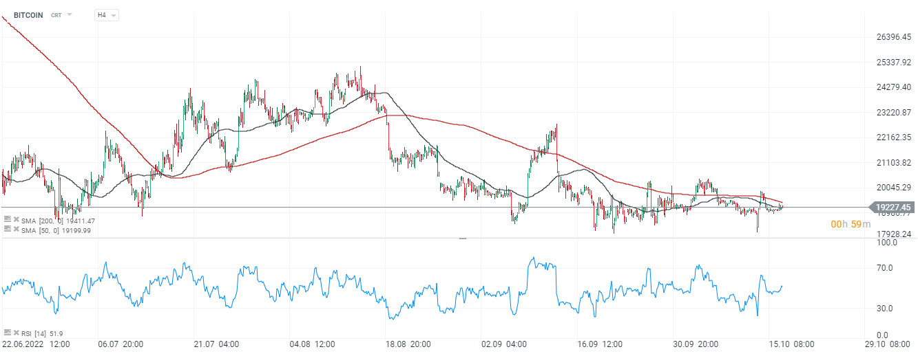 Bitcoin, H4 interval. The price is still moving below the 200-session average on the hourly interval, however, it turned out to be positive that the SMA50 average broke through the top again, which, with the successful defense of the $18,000 level from Thursday, could favor a rise above the SMA200, the last time we saw it in July this year. Source: xStation5
