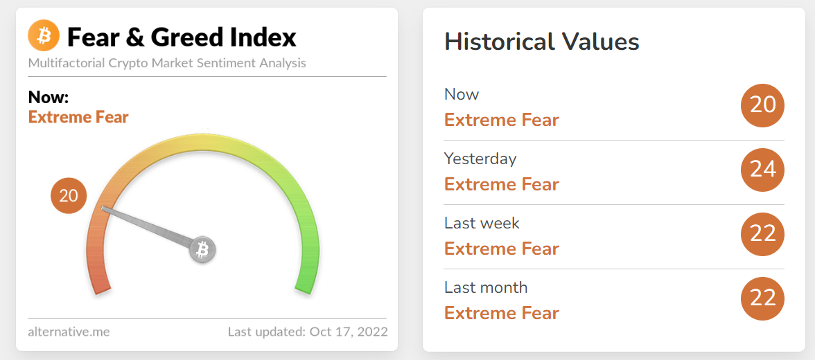 The 'Fear and Greed Index' continues to indicate levels of extreme fear of the Bitcoin market. Source: alternative.me