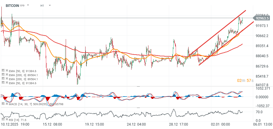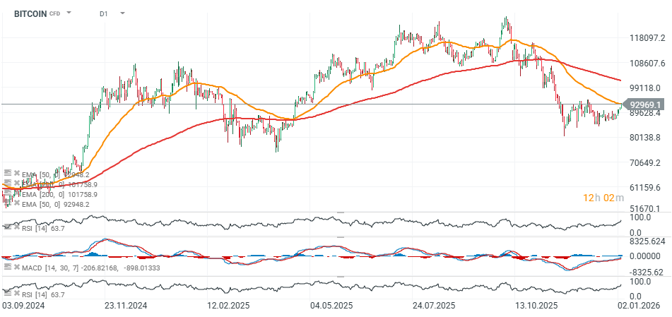 Bitcoin is rising today to nearly USD 93,000, i.e. the highest level since the first half of December 2025, amid positive sentiment on the U.S. stock market, where Nasdaq 100 and S&P 500 futures (US100 and US500) are gaining ahead of the open. Bitcoin is up more than 6% this year and has rebounded after falling to a record oversold level (RSI) last seen in August 2023. On-chain data point to historically high BTC accumulation by so-called whale addresses, while overall market sentiment remains largely subdued, opening the potential for trend continuation.