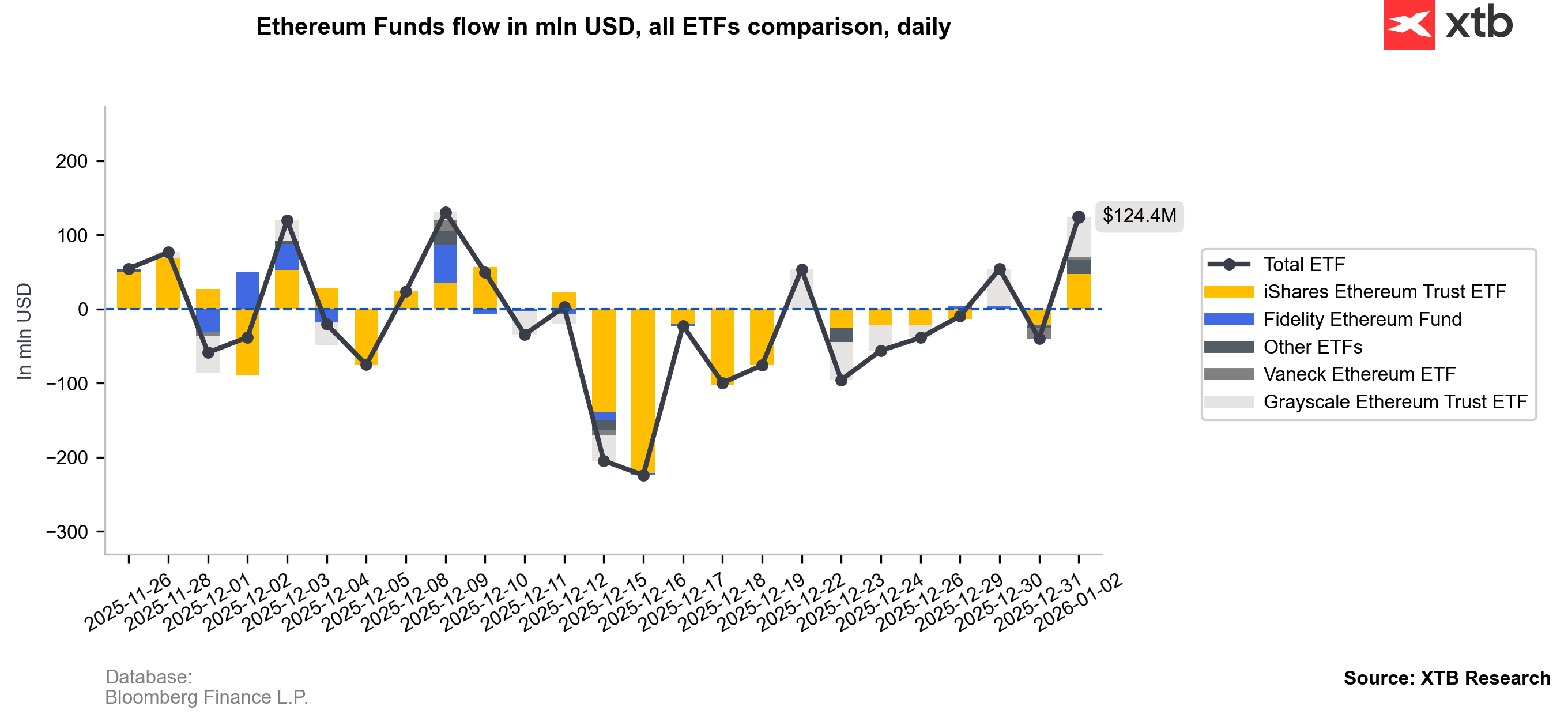- CoinShares data indicate that global inflows into cryptocurrencies in 2025 amounted to USD 47.2 billion, compared with USD 48.7 billion in 2024. During the last session of the previous week, on Friday, BTC and ETH ETFs recorded inflows of USD 464 million and USD 124 million, respectively.