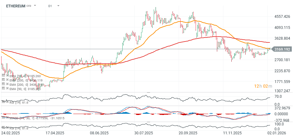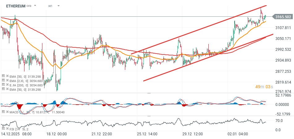 Similar to Bitcoin, Ethereum is also climbing today to levels not seen since mid-December. Key short-term support is indicated by the EMA50 on the hourly timeframe (around USD 3,100), while the lower boundary of the channel is around USD 3,050, where we also see the EMA200 (red line).