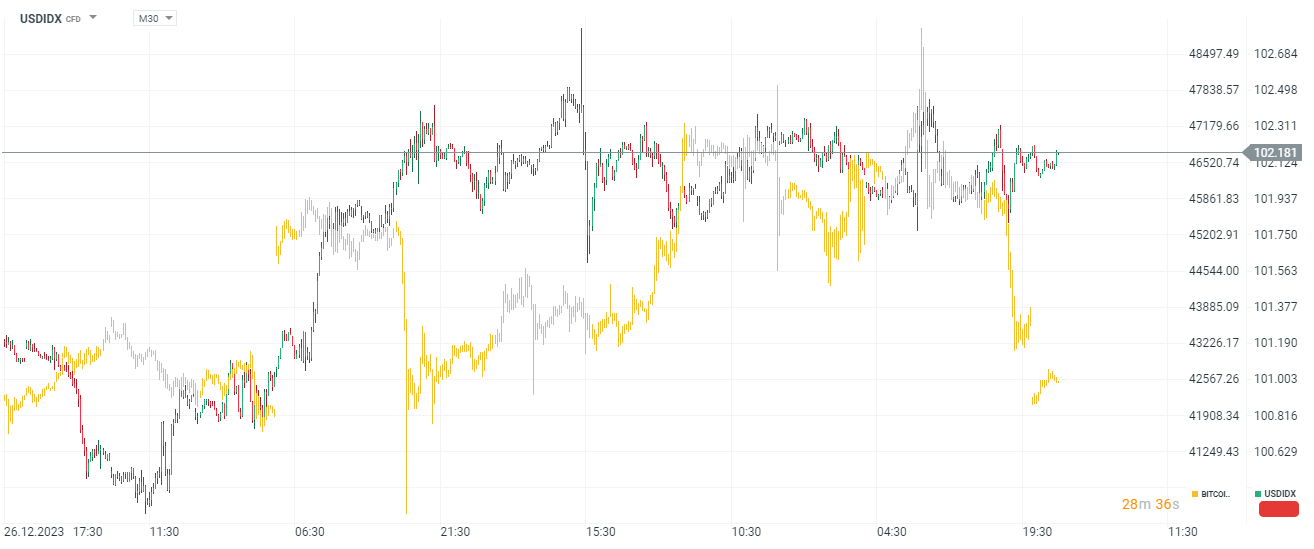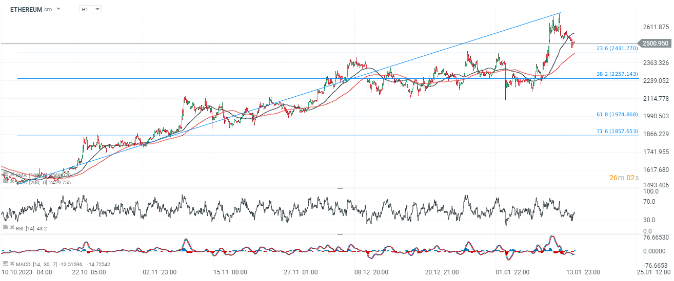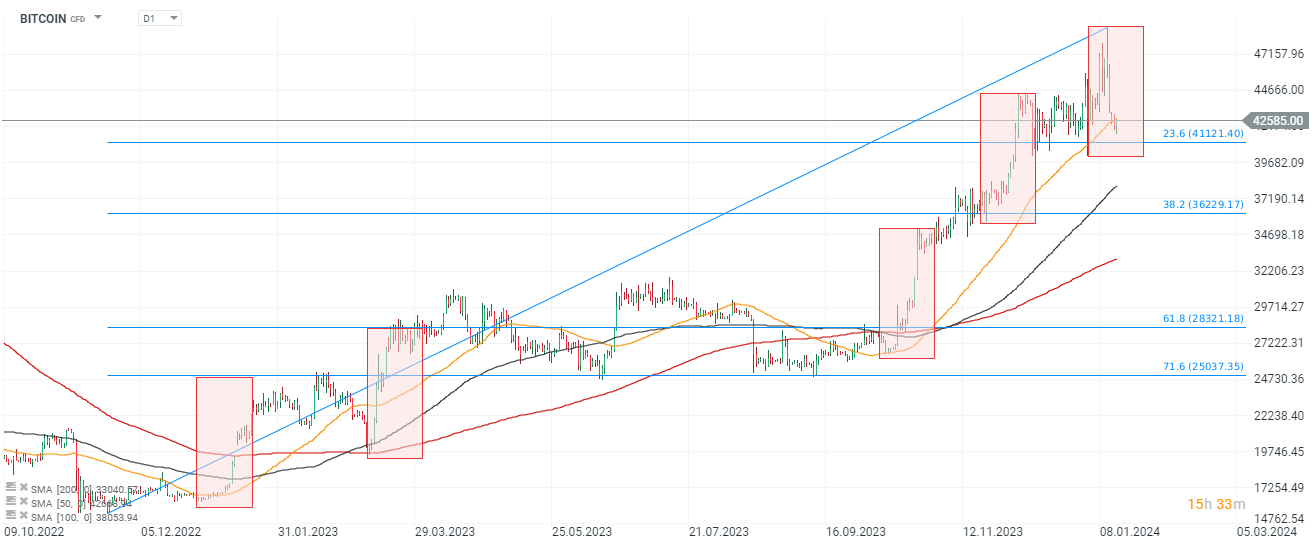 Cryptocurrencies have seen sizable declines since last Friday, with Bitcoin's correction from its highs near $49,000 amounting to more than 15%. However, the declines have been halted and the largest cryptocurrency is currently holding at $43,000, at a time when investors are paying $2,500 for Ethereum. The cryptocurrency market has been 'living' for months with the approval of ETF (ETP) applications at the SEC, and although there was no immediate 'selling the news' in the end the huge 'overhang' of profitable Bitcoin on the market started a wave of profit realization, the effects of which we are seeing.