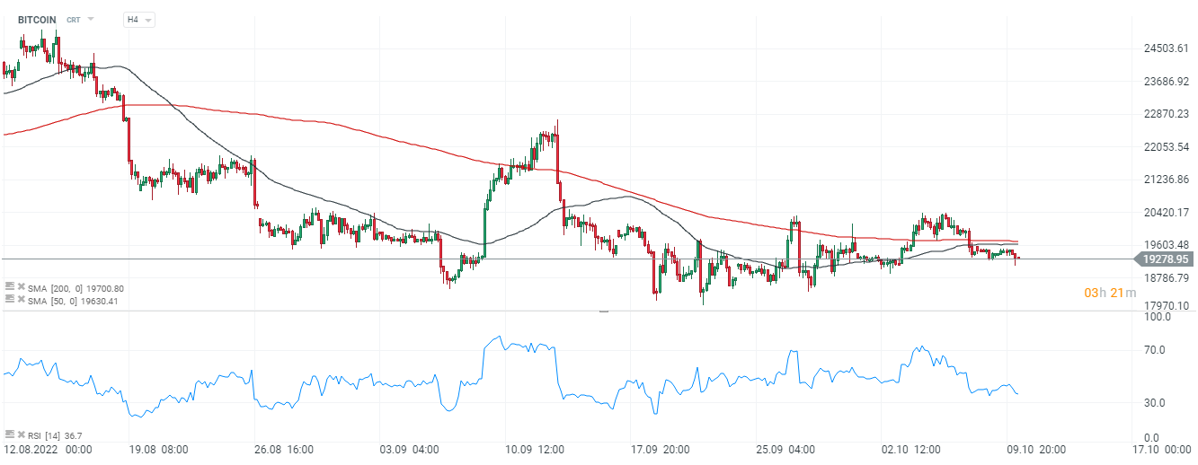Bitcoin, H4 interval. The price of the major cryptocurrency is still below the SMA 200 and below the SMA50, which raises concerns around a possible capitulation. In the second half of August we saw the so-called "death cross", when the 50-session average dipped below the SMA200, and since then we have seen a decline in sentiment, with the SMA50 unable to threaten the 200-session average. At the moment, a reverse cut of the SMA50 above the SMA200 could herald a change in trend and a 'golden cross' formation. However, this seems unlikely in the context of the dire atmosphere on the stock markets. RSI levels still look neutral. Source: xStation5.