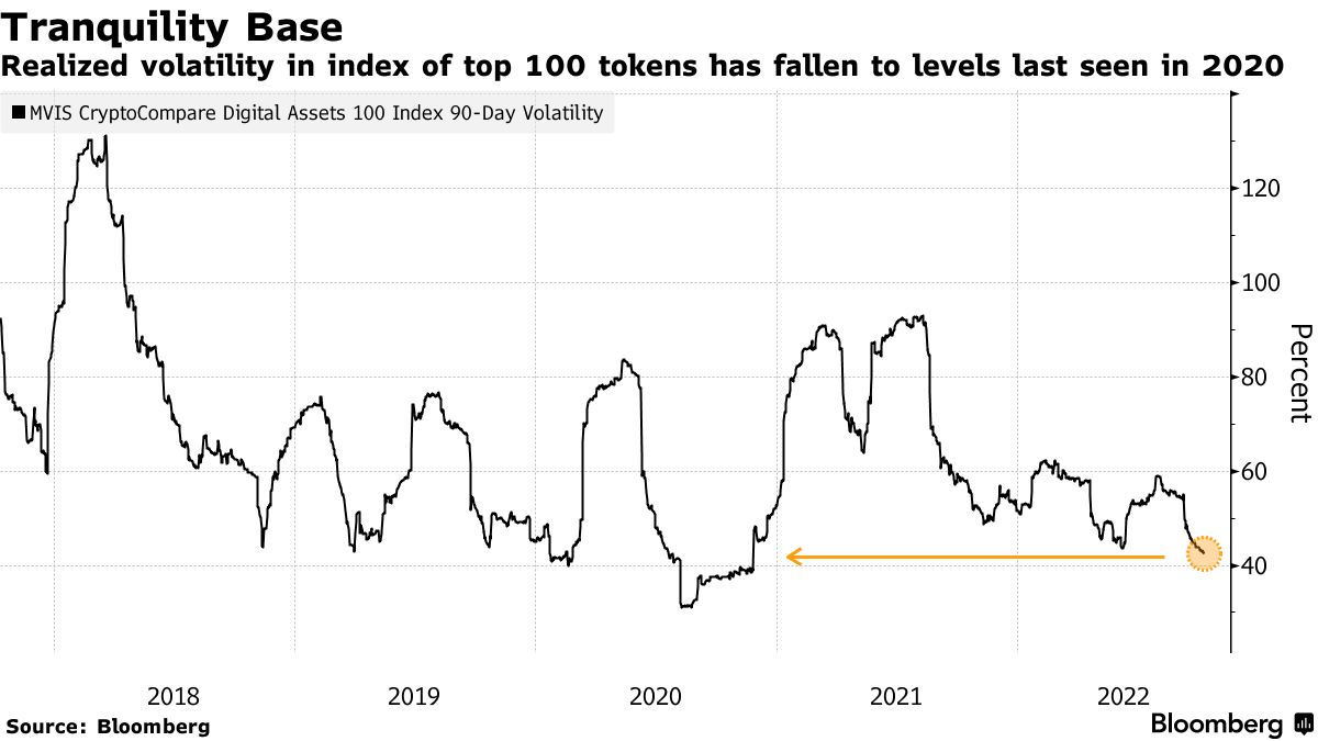 The volatility of cryptocurrency prices in the top 100 has fallen and approached levels last seen in 2020, with previous years never at such low levels. Source: Bloomberg