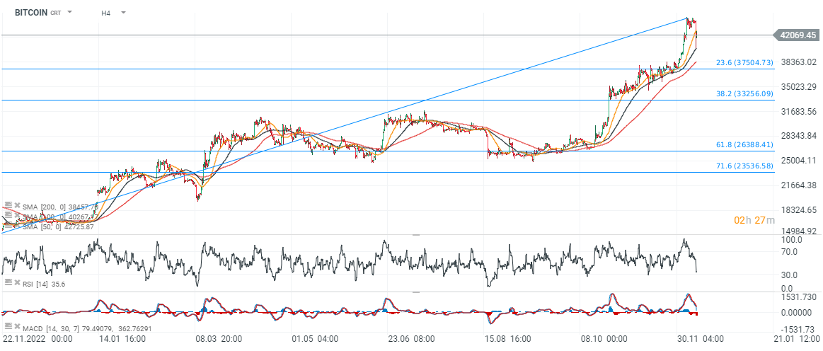 The largest of the cryptocurrencies is trading around 4% down today, although at its peak it was close to 8%. Looking at the MACD, such a dynamic correction can only be comparable to the declines of early September, when Bitcoin dived from $27,500 to around $24,000. If the upward structure were to be preserved, a further scenario seems to be a consolidation around $40,000.