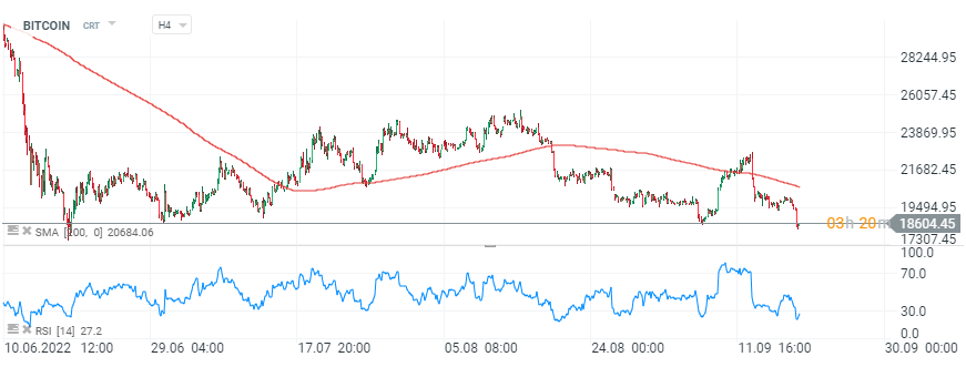 Bitcoin chart, H4 interval. The price of the major cryptocurrency has settled below $19,500 and is rebounding from levels at $18,500. The durability of the current rebound may determine whether Bitcoin will not break through the June minima again. The RSI is indicating levels close to oversold which may suggest an increasingly narrow downside range. On the other hand, a huge drop below the 200-session average on the four-hour interval, which runs at $20,600, could herald further, deeper weakness in the price. We can expect more volatility on Wednesday, when the Fed's decision on the amount of the next rate hike will be known at 8pm. So far, Bitcoin's initial reactions to Fed decisions have usually been positive. Until then, a consolidation in the $18,500 to $19,500 range is likely. Source: xStation5