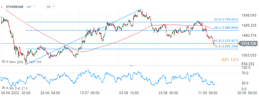 Ethereum chart, H4 interval. The cryptocurrency is in an almost twin situation to Bitcoin. Ether is more than 20% short of its 200-session average at $1,600, which 'swelled' during the rally under the merge. The price has stopped at the 61.8 Fibonacci retracement from where it is trying to reverse the cascading sell-off. Source: xStation5