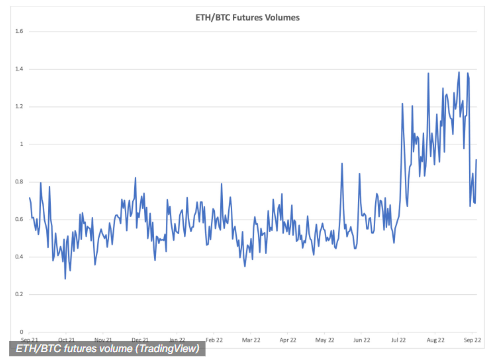 The volume of futures contracts on the ETH/BTC pair fell after Ether's dominance declined following the negative price reaction in 'The Merge' results. So it looks like the 'flippening' won't happen as soon as ETH fans wished. Source: Skew.com, TradingView.