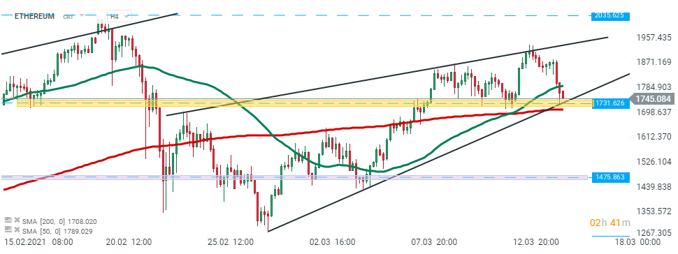 Bitcoin – yesterday price broke above the upper limit of the ascending channel and reached a new all-time high at $61,618. However buyers were unable to uphold momentum and price pulled back. Currently Bitcoin is testing local support at $55,400 which coincides with 50 SMA ( green line) and the lower limit of the above-mentioned channel is located slightly below. If sellers will manage to clear these two obstacles, then way towards support at $50,000 will be left open. On the other hand, if buyers manage to halt declines here, the upward move may be resumed. In such a scenario the next resistance to watch lies at $57,931. Source: xStation5