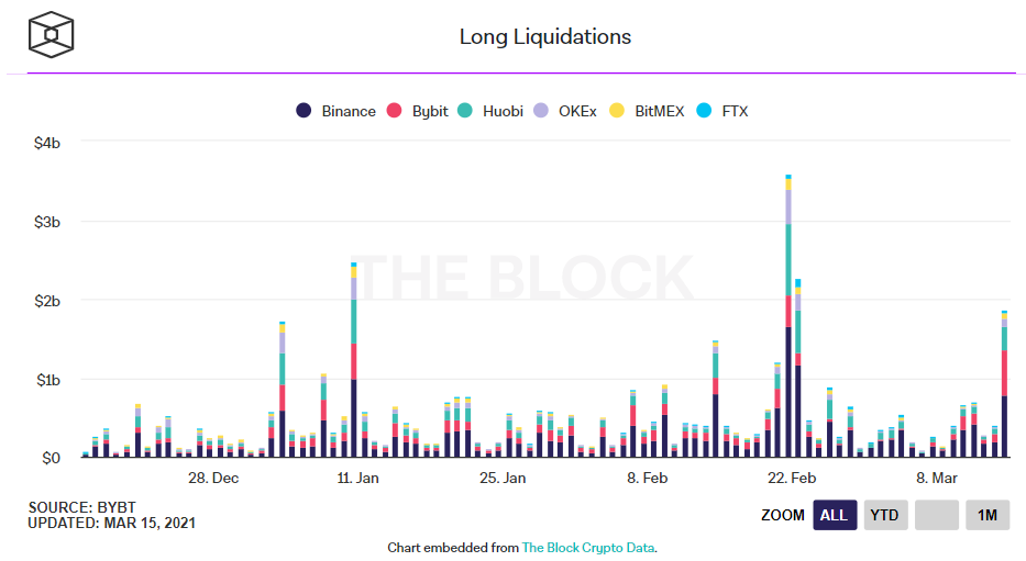 The largest single liquidation occurred on Huobi for bitcoin, valued at around $19 million. Source: Bybt.via The Block