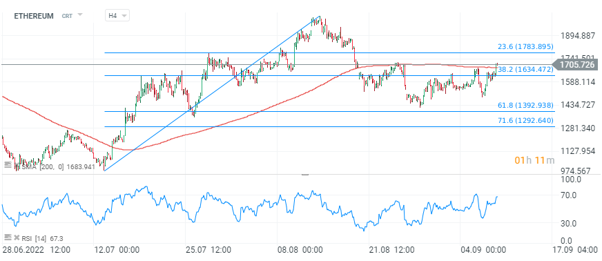 Ethereum chart, H4 interval. The 200-session average, the SMA 200, may prove to be the most significant element on the chart. The previous ascent above this average, on July 15, initiated a rally of nearly 100%. The rally in Ether's price after 'The merge' would indicate potentially growing institutional interest in the cryptocurrency, which will become a deflationary asset once the difficulty bomb is triggered. However, a worrying signal comes from the RSI, which indicates overbought, previously levels above 70 indicated an impending correction. On the other hand, however, analyzing the case of the breakthrough of the 200 SMA from mid-July, we see that an increase in the RSI is natural when demand breaks through key resistance zones and can hold at these levels for an extended period of time. The first significant resistance may turn out to be around the 23.6 Fibonacci retracement, which coincides with the local peak from the end of July this year. A potential drop below $1,600 could initiate another wave of panic even in the area of $1,300, where the entire trend initiated by the aforementioned ascent above the 200-session average on July 15 would be erased. Source: xStation5