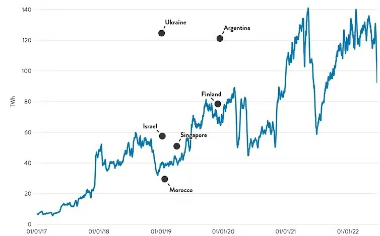 Bitcoin's consumption has dropped noticeably which is directly related to the declining activity of miners. At the same time, it still remains at a very high level, tokens using the Proof of Work consensus (diggers and miners approving a transaction as a result of computing power competition) may find themselves subject to strict regulation in the future, however, they do not fit into the organic institutional narrative of ESG (Enviromental, Social and Governance) by which institutional demand may decline. Source: CoinShares