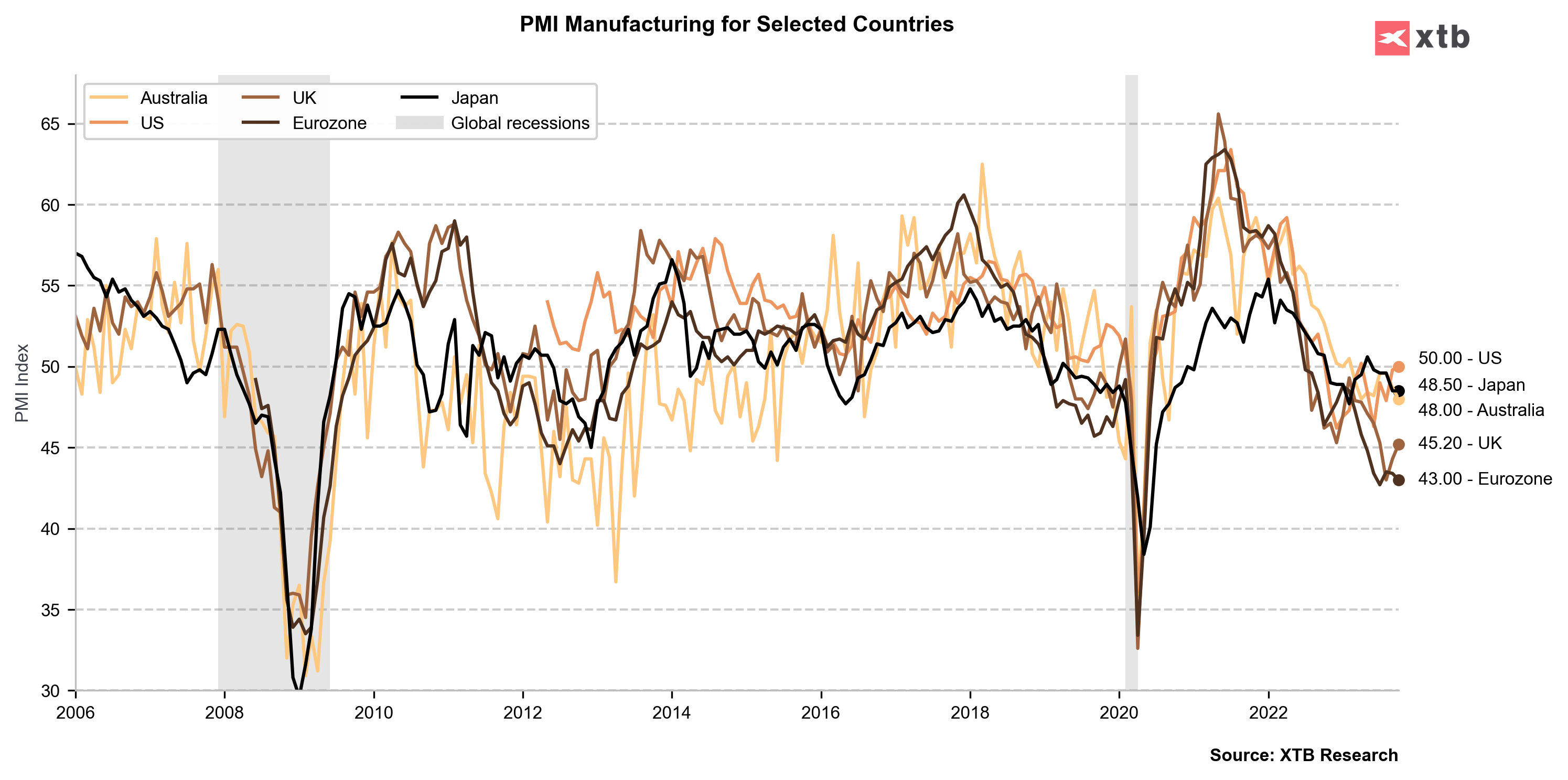 In the U.S., on the other hand, the PMI indexes surprised positively, with the industrial index coming in at exactly 50 points, while the services index came in at 50.9 on expectations of a drop below 50 points