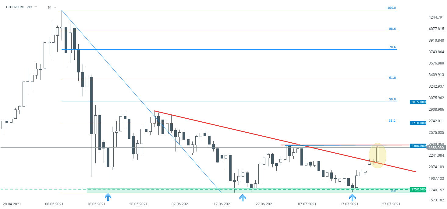 Ethereum posted solid gains today and price broke above the local trendline, which may indicate a continuation of the upward move. However, the price has now reached the resistance at $ 2,380, which is marked with earlier price reactions. However if buyers will manage to uphold current momentum, then, the next target for the market bulls is located around $ 2710 and is marked with 38.2 Fibonacci retracement of the last downward wave. Source: xStation5