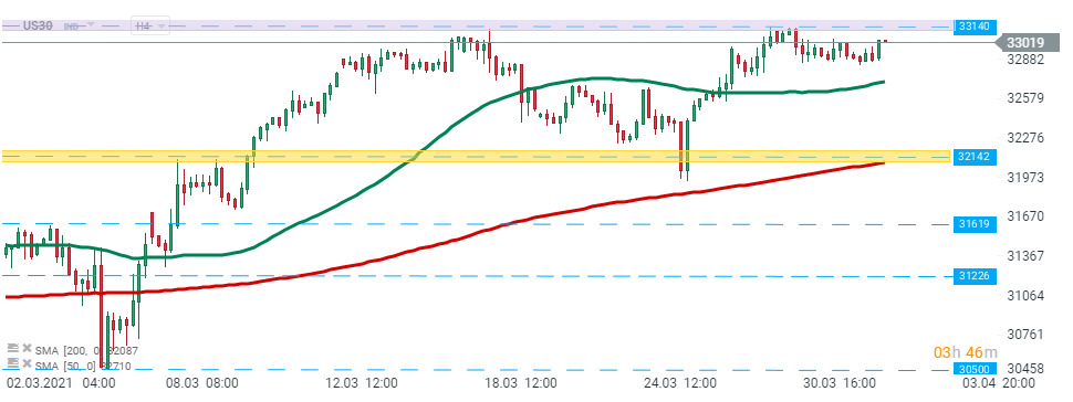 US30 (blue-chip DowJones contract) followed S&P 500 footsteps and is approaching its record high at 33140 pts. Source: xStation5