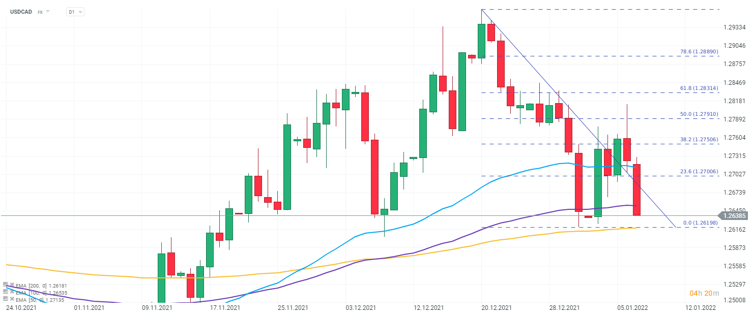 Good employment data caused a sharp appreciation of the Canadian Dollar, which is now approaching the supports marked by local minima and EMA 200 (gold line). The nearest resistance for the pair remains the 23.6% Fibo retracement. USDCAD, D1 interval. Source: xStation 5
