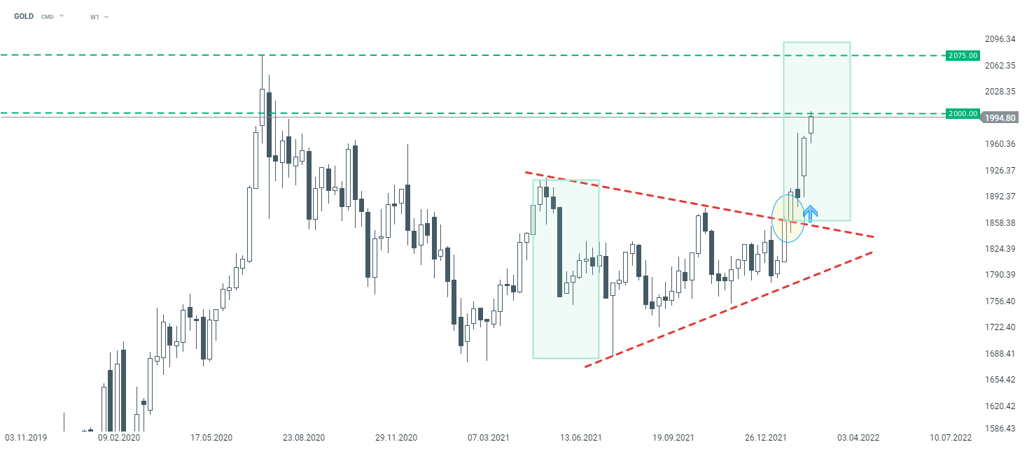 The escalation of Russia's aggression in Ukraine is supporting the prices of precious metals. Gold continues to rise after the breakout from the triangle formation. Source: xStation5