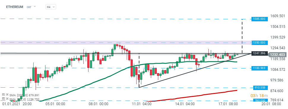 Ethereum price is testing the upper limit of the ascending triangle pattern at $1,247.00 and breakout above can push the price towards all time high at $ 1350.00. However the distance between the triangle's highest points suggests that Ethereum price may reach new ATH around $1585 level. On the other hand, if sellers manage to halt declines here and break below the lower limit of the formation, then larger correction could be on the cards. The nearest support lies at $1100. Source: xStation5