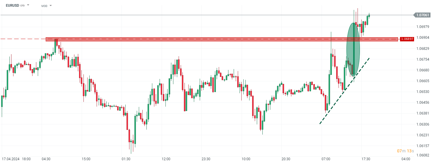 EURUSD is traded above significant 1.0689 resistance zone and above psychologically important 1.07 level. Source: xStation