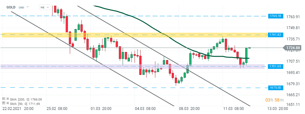 Gold launched today’s session lower, however buyers failed to break below the strong support at $1700,00 and price managed to erase part of the recent losses. Precious metal also broke above 50 SMA ( green line) and if the current sentiment prevails, upward move could be extended to the resistance at $1741.00. However if sellers will manage to regain control and break below the aforementioned $1700.00 level, then next support at $1675 could be at risk. Source: xStation5