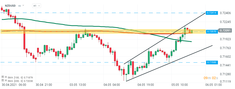 NZDUSD is one of the strongest currency pairs today after falling sharply on Tuesday. Pair manage to break above major 0.7207 level which coincides with 200 SMA (red line). If the current sentiment prevails, upward move may accelerate towards resistance at 0.7241, however before this happens buyers will need to break above the upper limit of the broadening wedge formation. On the other hand, if sellers will regain control, then nearest key support lies at 0.7150. Source: xStation5