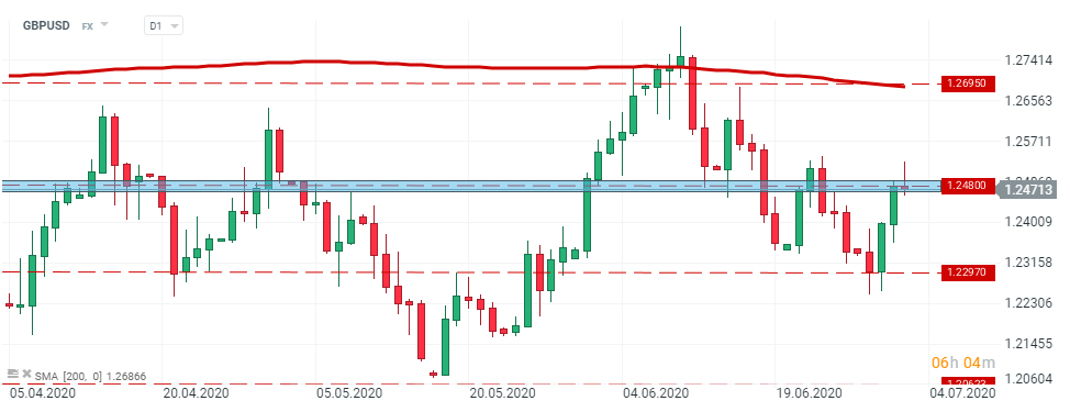 GBP/USD - cable erased early gains to trade flat at $1.248 on after negotiations between the EU and the UK ended today, a day earlier than expected. Both sides confirmed that divergences remain on a number of important issues. Still, talks should continue as planned next week. Should downbeat moods prevail, support at 1.2297 may come into play. Source: xStation5