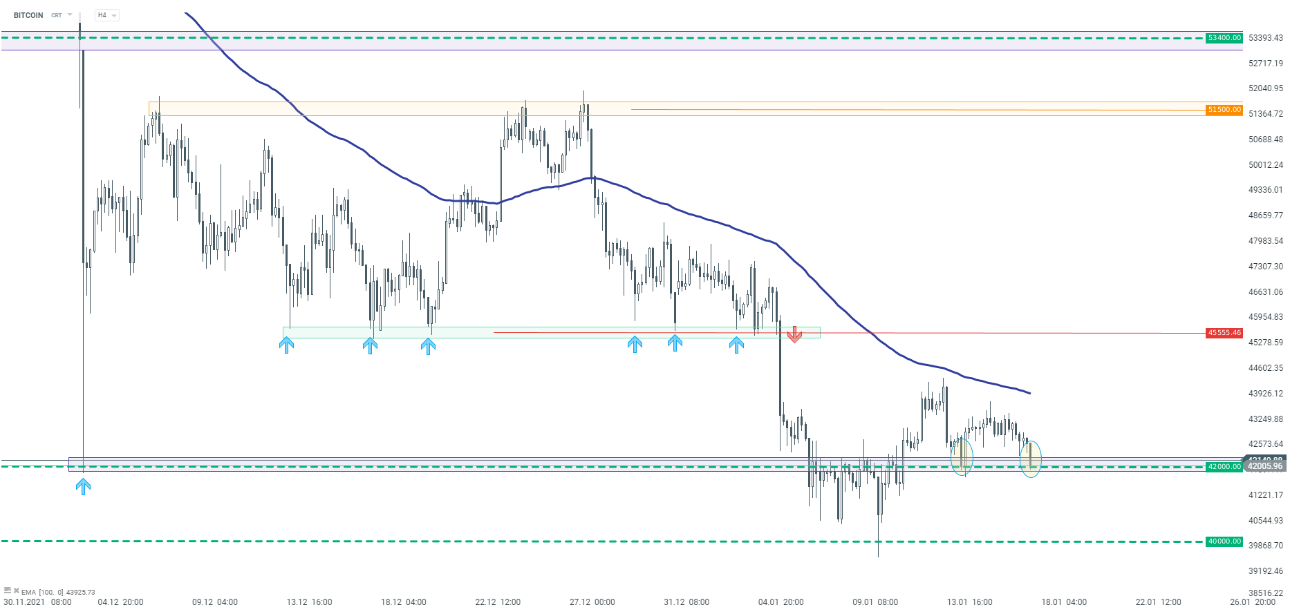 Bitcoin is not doing well today. Looking at the H4 interval, we see a renewed attack on the key horizontal zone at $42,000. This level was a support on January 14, however, despite the rebound, the price did not manage to go above the average of the last 100 periods - blue line on the chart. If the previously mentioned support at $42,000 is broken, the declines may become stronger. Source: xStation 5