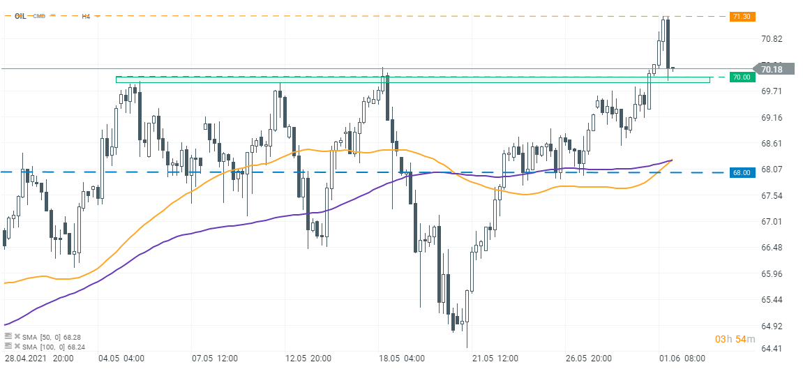 Brent prices (OIL) smashed through key $70 a barrel level today, reaching highest levels since early-March. However, oil suddenly dipped in the afternoon, paring some earlier gains. This does not change the fact that the prices are still trading higher on the day and remain above the $70 mark - key short-term support for now. Source: xStation5