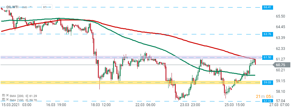 WTI crude (OIL.WTI) moved sharply higher today, however buyers failed to break above major resistance at $61.50 on first attempt and price pulled back. The nearest support lies at $59.86 and coincides with 50 SMA ( green line). On the other hand, should break above the aforementioned resistance occur, then another upward impulse towards $63.76 could be launched. Source: xStation5