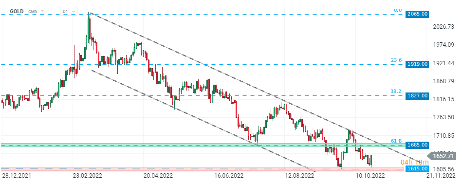 Gold bounced off major support at $1615 per ounce on Friday amid weaker dollar and lower treasury yields. Nevertheless as long as price sits below key resistance at $1685 per ounce, the main trend remains bearish. The aforementioned support is marked with 38.2% Fibonacci retracement of the upward wave launched in March 2020 and lower limit of the descending channel. Source: xStation5