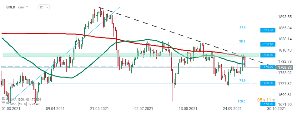 Gold prices rose sharply in the first part of the week, however buyers failed to break above the major resistance zone around $1800.00 and the price pulled back. Currently gold is testing local support at $1770.00 which coincides with 61.8% Fibonacci retracement of the last upward wave launched in March and 50 SMA (green line). Should break lower occur, downward move may accelerate towards major support at $1730 which is marked with previous price reactions and 78.6% retracement. Source: xStation5