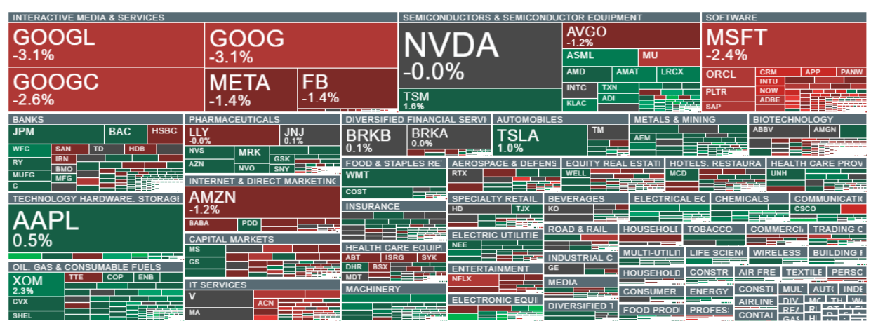 Sentiment is improving today in the semiconductor, electronics, banking, and oil & gas sectors. In contrast, the IT sector is underperforming, with shares of Alphabet (GOOGL.US) and Microsoft (MSFT.US) both down करीब 3%. Source: xStation5