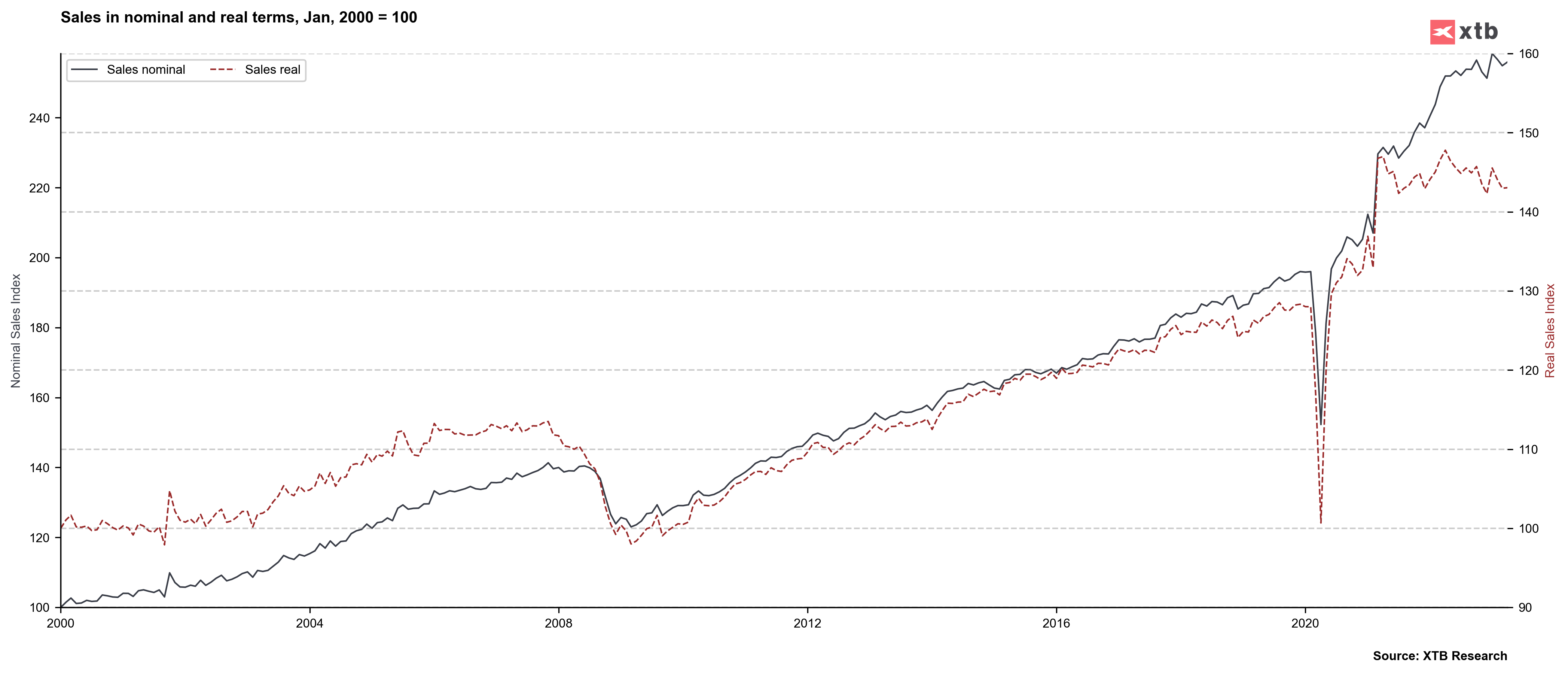 US retail sales climbed in April, following a drop in March. However, the situation looked less upbeat in case of real retail sales as gap between the two continues to grow. Source: Macrobond, XTB