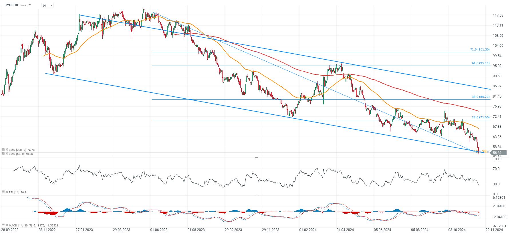 Porsche shares are testing the lower range of the declining price channel today and are losing nearly 55% from historical highs. Bloomberg indicated that Volskwagen may be considering closing and selling the Osnabrück plant, where Porsche Boxter and Cayman models are assembled.