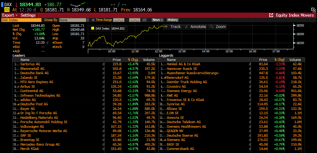 Most of the DAX40 companies are up today. Sartorius, Rheinmetall, Deutsche Bank and Zalando stand out with increases. Porsche and Volkswagen are also doing better. Henkel and Beiersdorf are the weakest DAX components today. Source: Bloomberg Finance L.P
