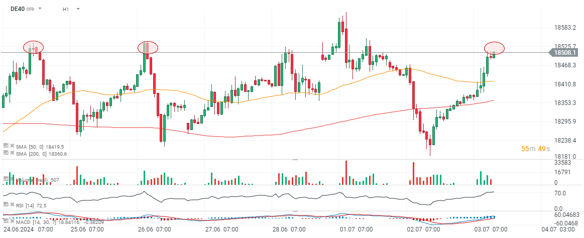 Buyers prevail on European stock markets today, with the DAX index back above 18,500 points. June PMI revisions from the Old Continent came in slightly weaker than before; invariably, services are the biggest inflation risk. Among German companies, the standouts today were Rheinmetall, for which Morgan Stanley raised forecasts, and Sartorius, whose dynamic rally is rather puzzling and coincided with the news of the non-renewal of the contract for its acting CEO of 20 years, Dr. Kreubzerg. We are also seeing better sentiment among Volkswagen, Porsche, BMW and Mercedes shares, which have sold off in recent days. We are also seeing gains in the shares of steel maker Thysenkrupp (TKA.DE) and Detutsche Bank (DB.DE), which is gaining nearly 4%.