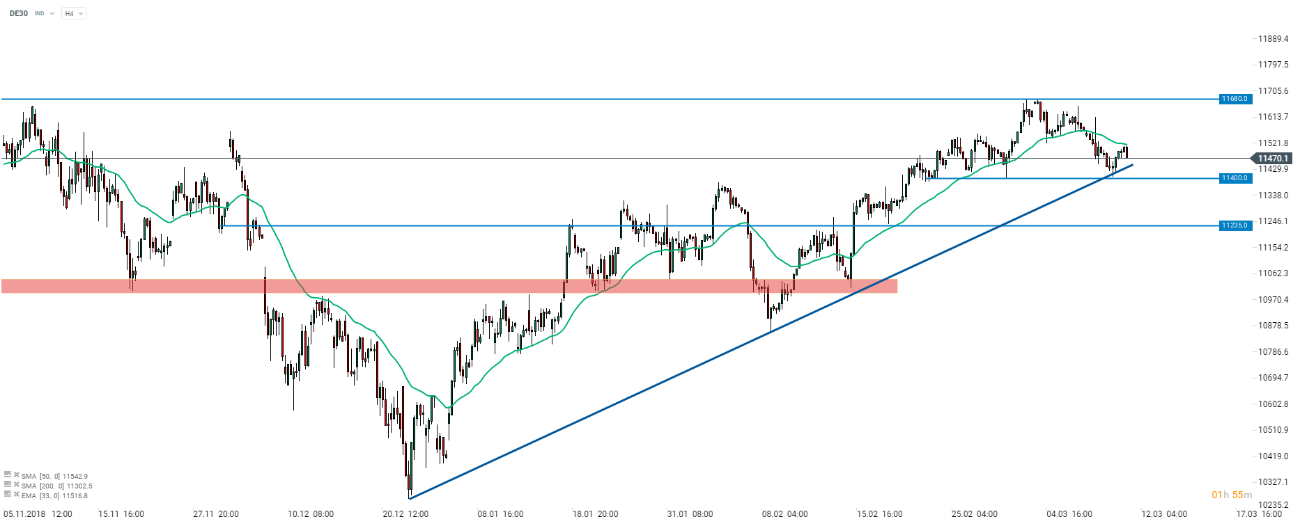 DE30 (DAX futures underlying) pushed higher during the Asian session but began to struggle following cash open in Europe. The German index is pulling back from the vicinity of 33-period moving average (green line, H4 interval) and may be set to retest previous swing level around 11400 pts handle. However, short-term upward sloping trendline runs earlier and bears may find some kind of buyers’ resistance there. Source: xStation5