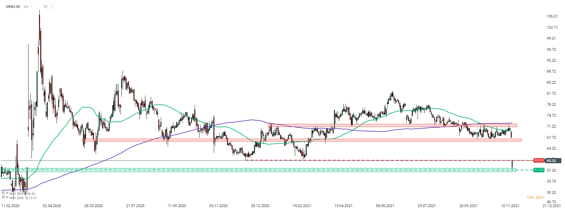 Draegerwerk (DRW3.DE) slumped today at the launch of a cash session, being pressured by lacklustre guidance for 2022. Stock dropped to the lowest level since mid-March 2020 and tested support zone at €57.50, that saw numerous price reactions ahead of the pandemic. Stock started to recover but struggles with breaking above local lows December 2020 and March 2021 (€60.60 area). Source: xStation5