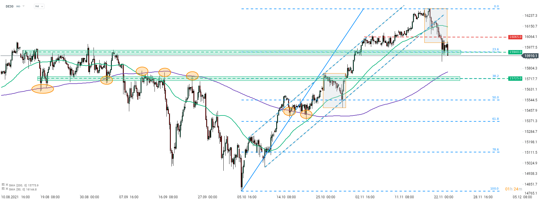 Downward correction on the DE30 was halted at the 15,940 pts support yesterday, marked with the 23.6% retracement of the recent upward impulse. However, the index makes another attempt of breaking below the zone today. Should it succeed, declines could deepen. In such a scenario, the first major support to watch will be the 200-period moving average on H4 interval (purple line) that currently runs in the 15,775 pts area. This moving average was tested a few times over the past 3 months (orange circles). Index broke below the lower limit of the local market geometry yesterday suggesting that continuation of the downward move is the base case scenario.