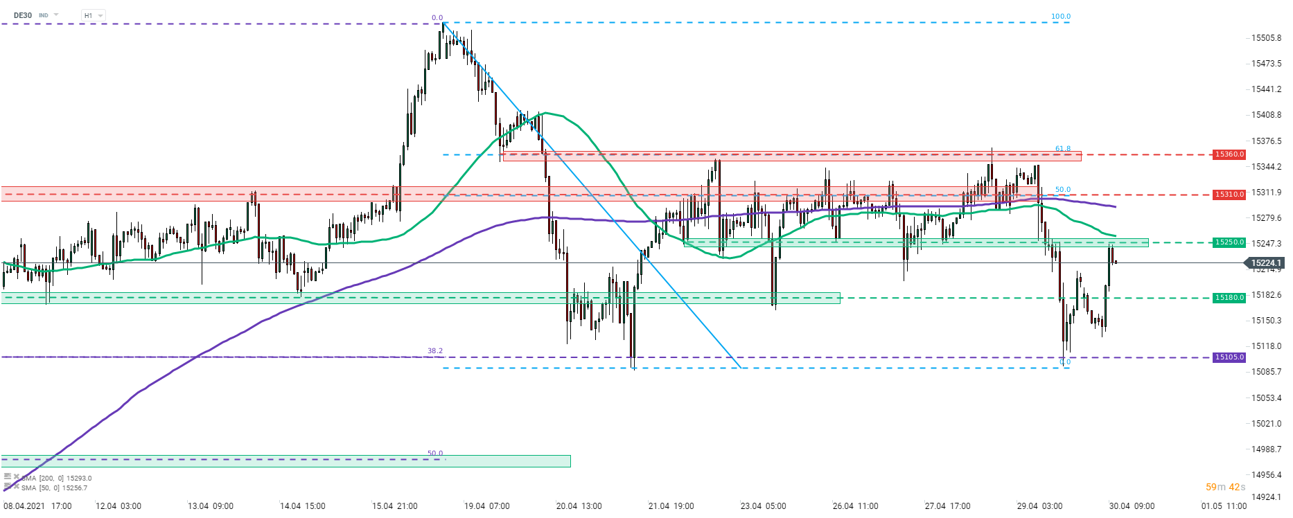 Yesterday's plunge on DE30 has led to a test of lows from April 21 and the 38.2% retracement of the upward move started at the end of March (15,105 pts area). German index is recovering today and has tested the 15,250 pts price zone. This zone served as a lower limit of recent short-term consolidation and is additionally marked with the 50-hour moving average (green line). Failure to break above the aforementioned price zone could trigger a pullback towards the 15,180 pts support.