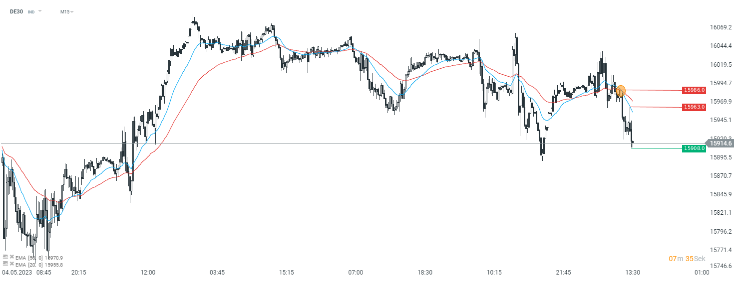 The German benchmark index slipped below the local lows this morning. This led to a crossover - a confirmation that the bears have the advantage. The index is vulnerable to further losses, especially if the weekly low is breached. Key resistance levels are at 15,963 and 15,986 points.
