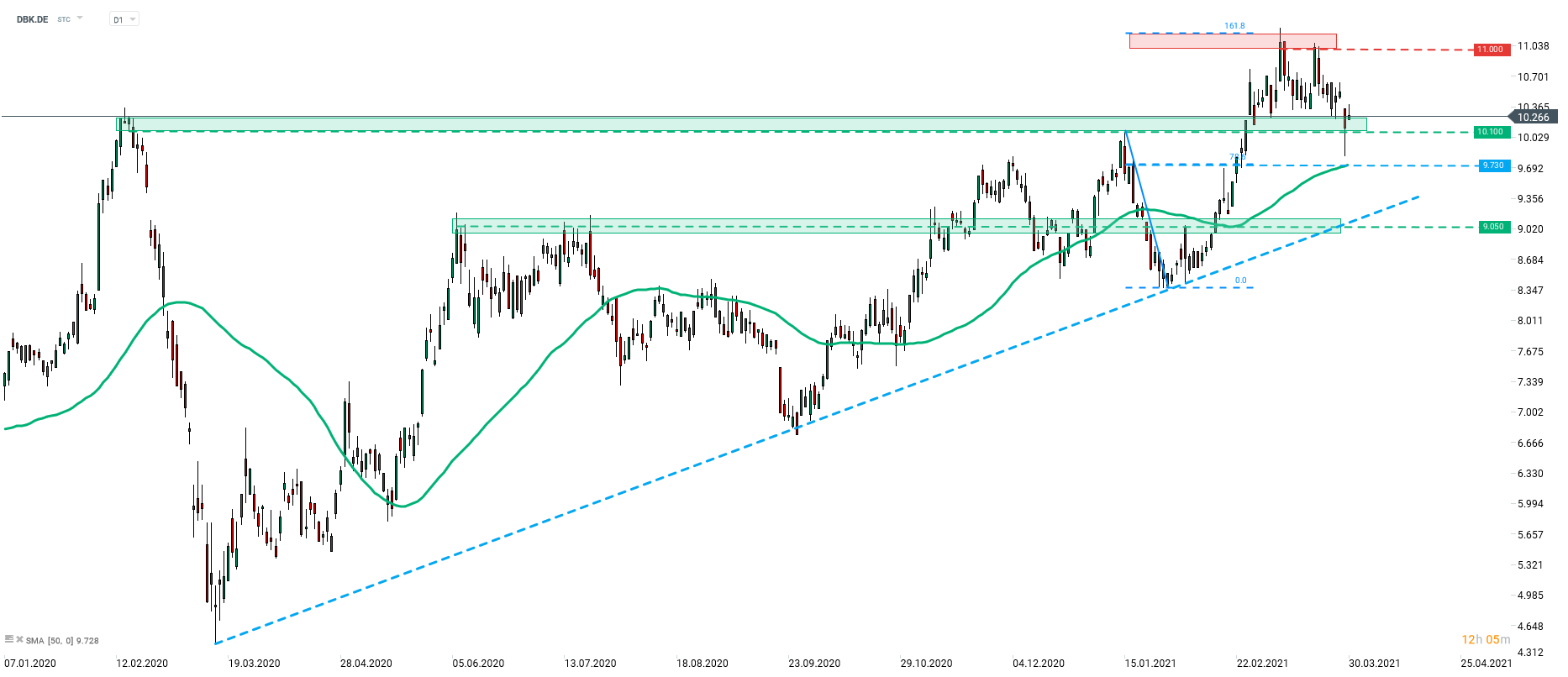 Deutsche Bank (DBK.DE) halted recent pullback at the support zone ranging above €10.10. Long, lower wick of yesterday's candlestick hints that bulls remain strong. The near-term resistance zone to watch in case recover continues can be found between €11.00 and 161.8% exterior retracement of a January's correction. Source: xStation5