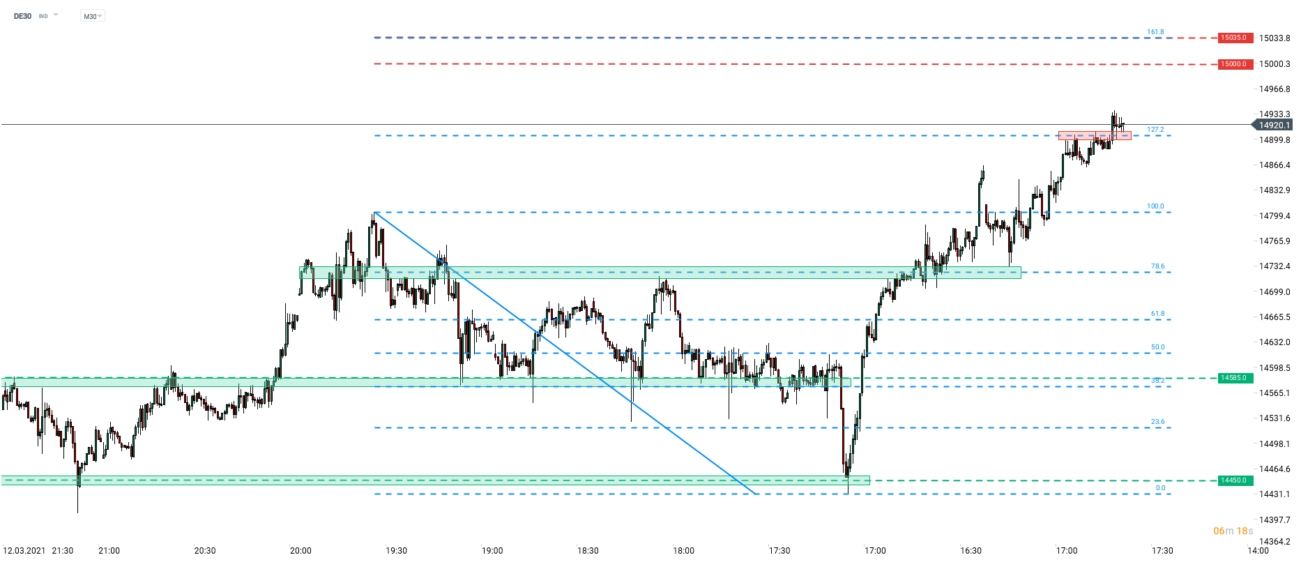 DE30 reached a fresh all-time high today after breaking above a short-term resistance at 14,900 pts marked with 127.2% exterior retracement of the downward move started in mid-March. Index halted advance slightly below 14,940 pts mark and pulled back to retest the aforementioned 14,900 pts price zone. If the upward move is resumed, the near-term resistance levels to watch are 15,000 pts and 15,035 pts. The first one may turn out to be a short-term resistance due to the psychological nature of round levels while the second is marked with the 161.8% exterior retracement.