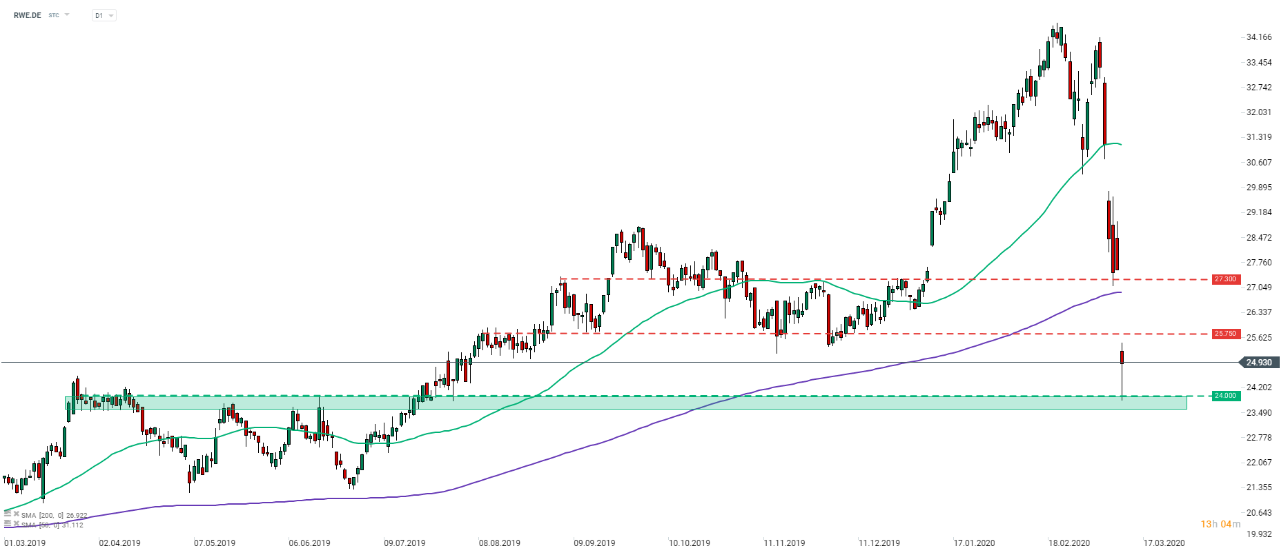In spite of utilities being labelled defensive stocks, RWE (RWE.DE) does not seem to be favoured by investors. The stock is trading over 25% below late-February peak. Solid full-year results were overshadowed by poor earnings growth guidance. However, share price started to recover after a test of €24 handle. Two resistance levels to watch, should the rebound continue, are €25.75 and €27.30. Source: xStation5
