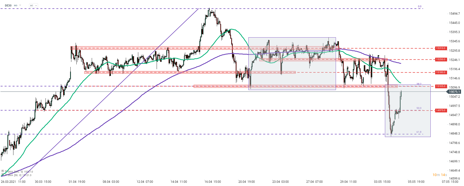 DE30 plunged yesterday on the back of hawkish comments from US Treasury Secretary Janet Yellen. German index dropped to the lowest level since late-March 2021. Yesterday's daily low was reached near the 61.8% retracement of the upward move started on March 25, 2021. Strong upward move was launched later on as Yellen backtracked on her interest rate comments. The near-term resistance level to watch on DE30 can be found at 15,105 pts. This area is marked with previous price reactions, 38.2% retracement, 50-hour moving average as well as the upper limit of a local market geometry. Breaking back above it could put the index on track toward recent all-time highs.