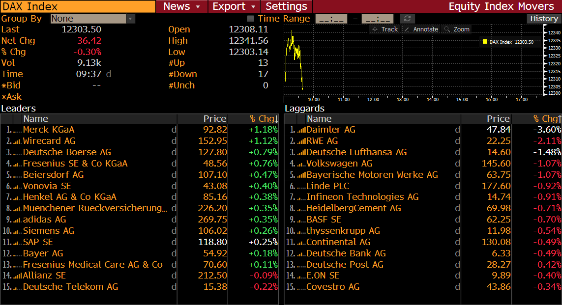 Daimler (DAI.DE) is leading the losses this morning following another profit forecast cut made by the company. Source: Bloomberg